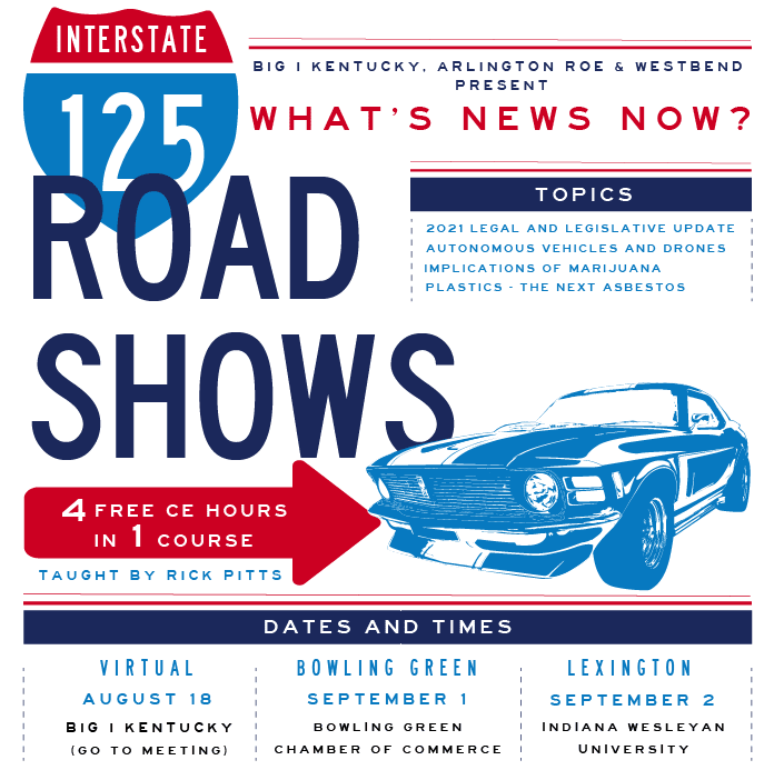 2021 Road Show- Bowling GreenWednesday, September 1, 2021 (9:00 AM - 1:30 PM) (CDT)DescriptionJoin us for 4 hours of CE with lunch for FREE with instructor Rick Pitts. His course "What's News Now" will cover everything from Legal and Legislative update to Cybersecurity to Covid-19 to Technology and more! Images