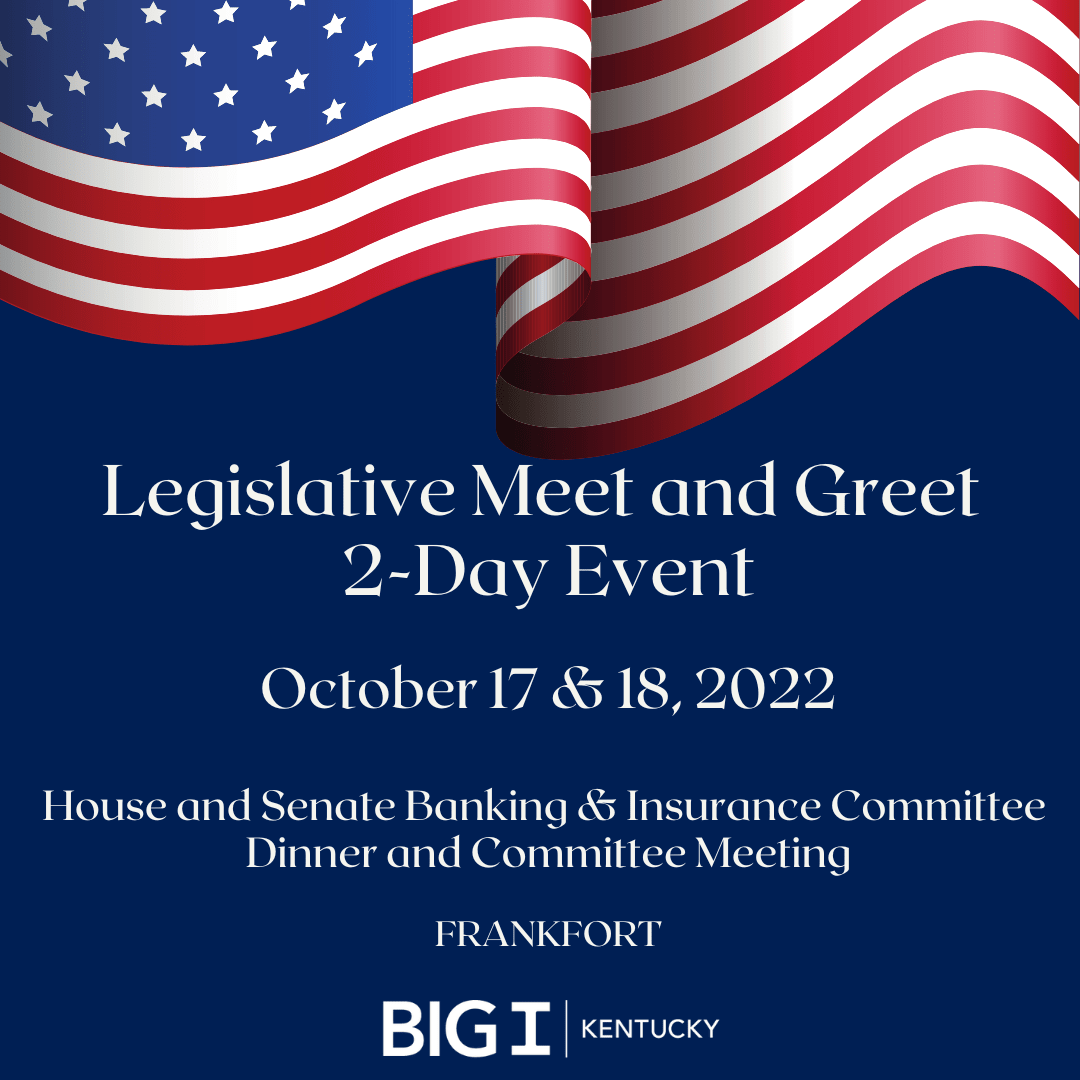 Legislative Meet & GreetMonday, October 17, 2022 5:00 PM - Tuesday, October 18, 2022 11:00 AM (EDT)DescriptionOctober 17, 2022 House and Senate Banking & Insurance Committee Dinner Location: The Foundry- 317 W Broadway Frankfort, KY 40601 Time: 5-8 pm October 18, 2022 House and Senate Banking & Insurance Interim Joint Committee Location: Capitol Annex- 702 Capital Ave Frankfort, KY 40601 Time: 10 am *This meeting is FREE to all who would like to attend. The cost of registration is for dinner. Please email info@bigiky.org if you'd like to attend the meeting only.* If you need a hotel check out these options: Images